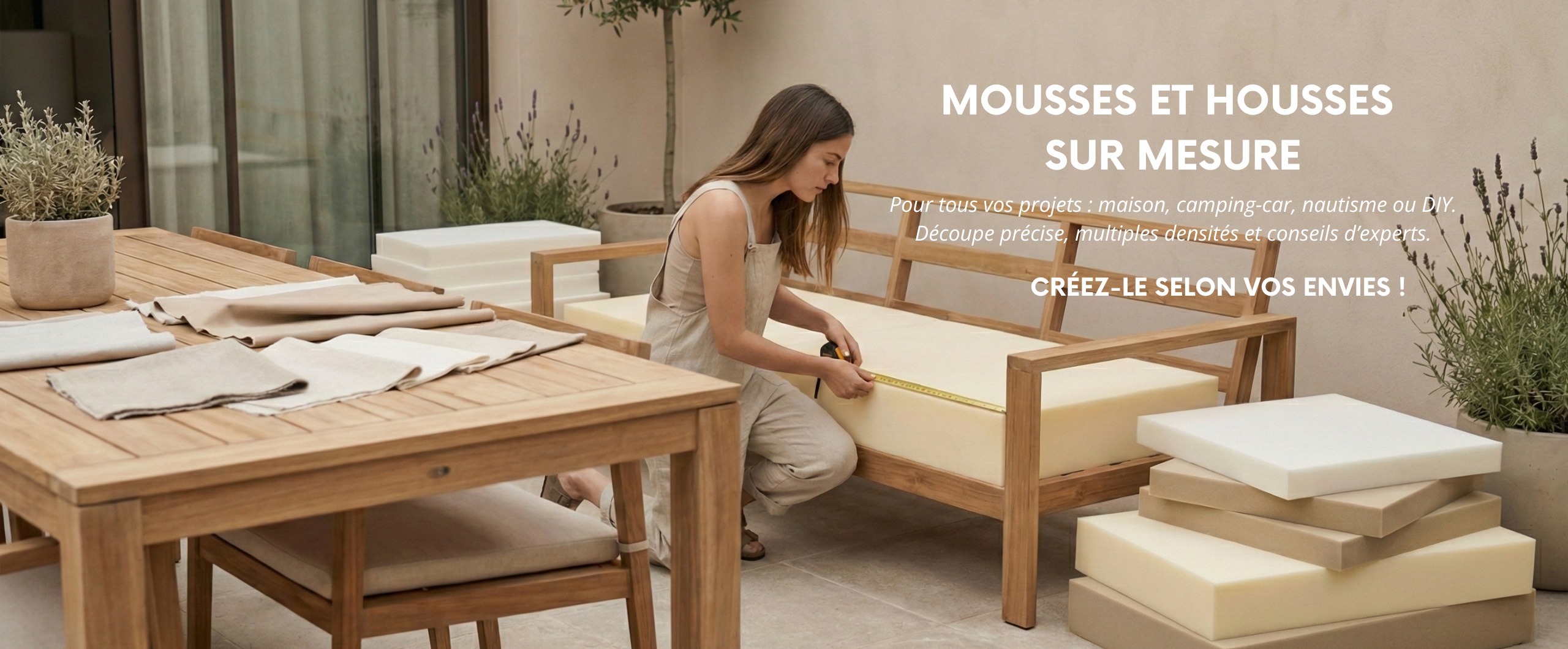 Personnalisez tous nos produits selon vos besoins. Que ce soit pour renouveler vos meubles d'extérieur, retapisser vos canapés ou équiper votre véhicule, nos housses et mousses s'adaptent à tous vos projets.